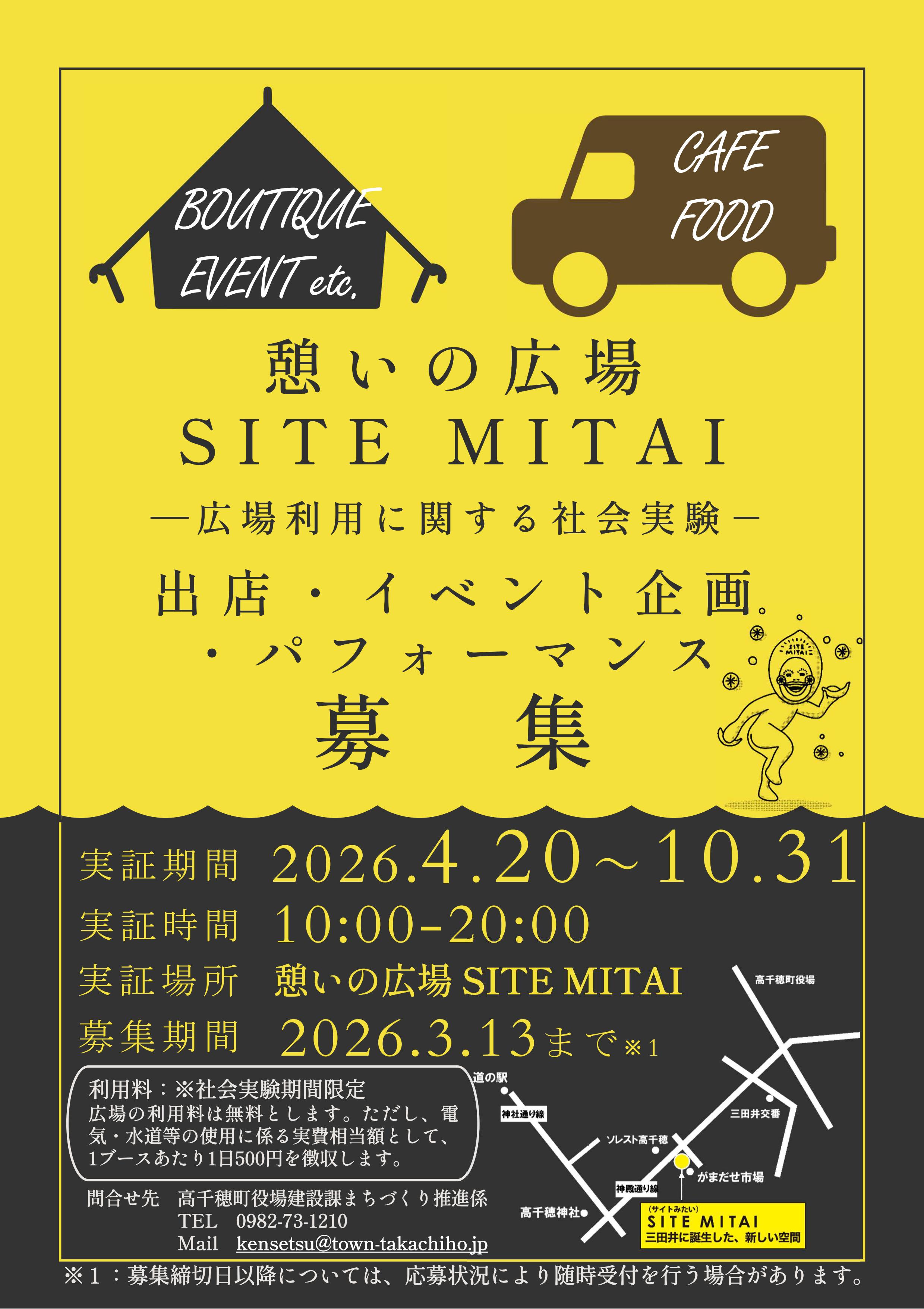 憩いの広場「SITE MITAI」広場利用に関する社会実験 出店・パフォーマンス・イベント企画 募集のお知らせ