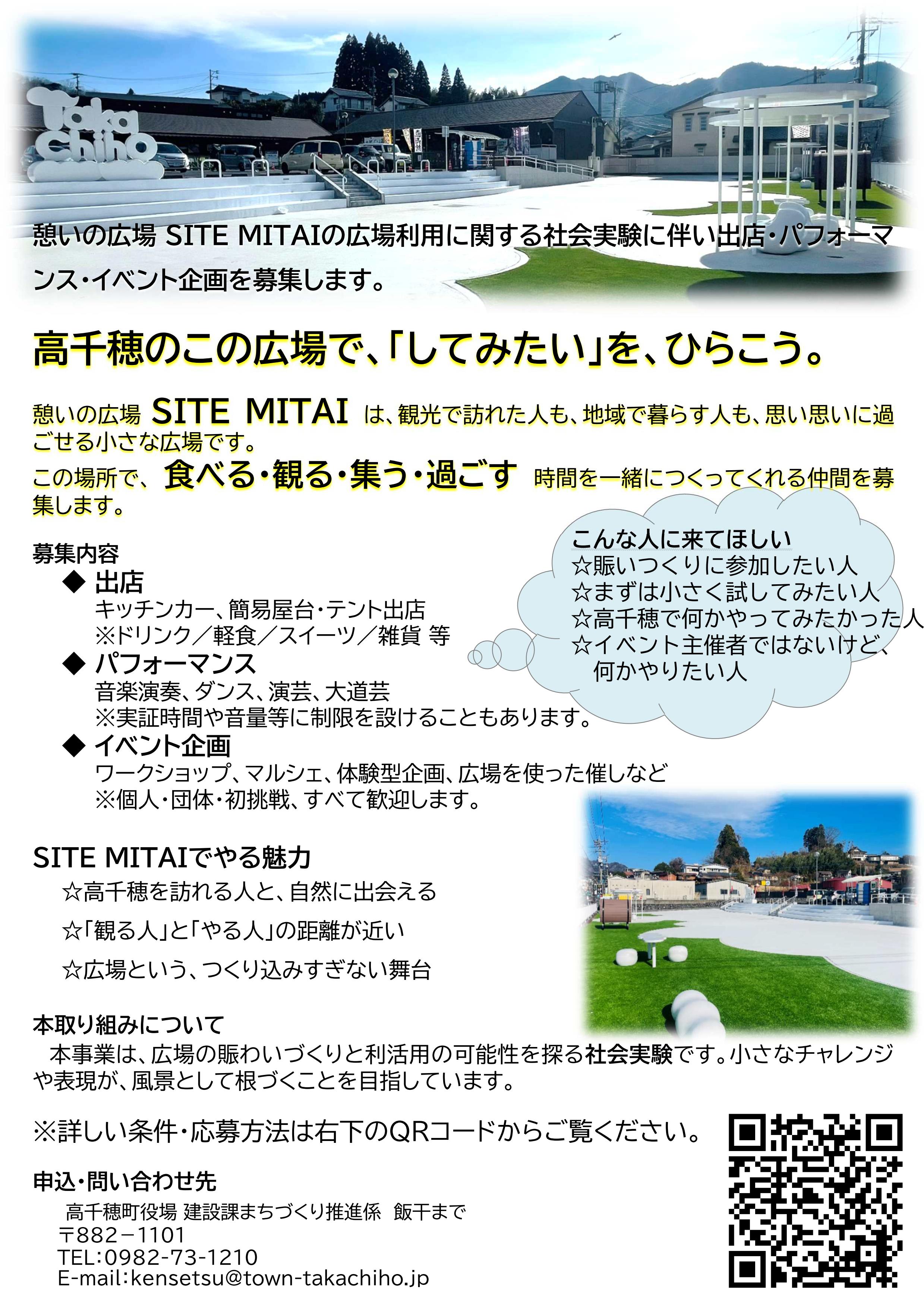 ・高千穂町では、憩いの広場「SITE MITAI」のにぎわい創出と利活用の可能性を検証するため、広場利用に関する社会実験を実施します。