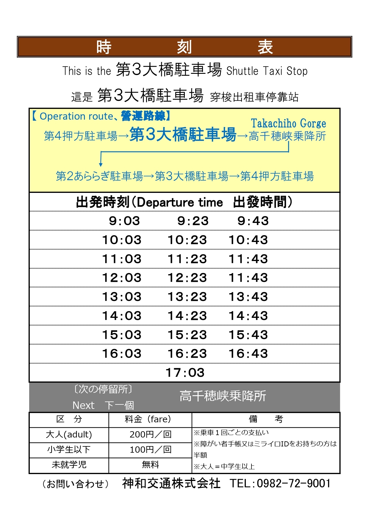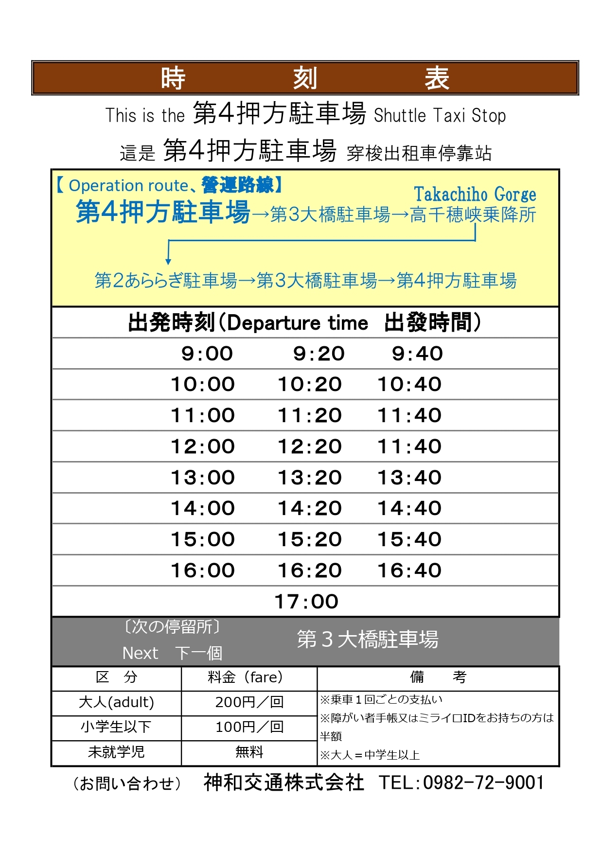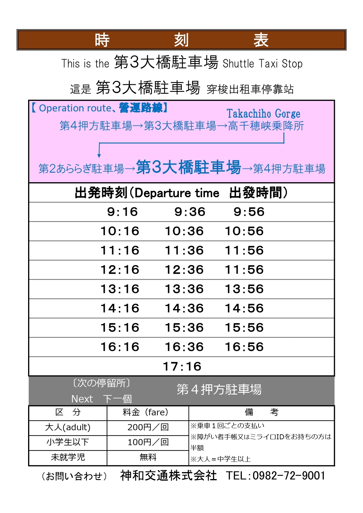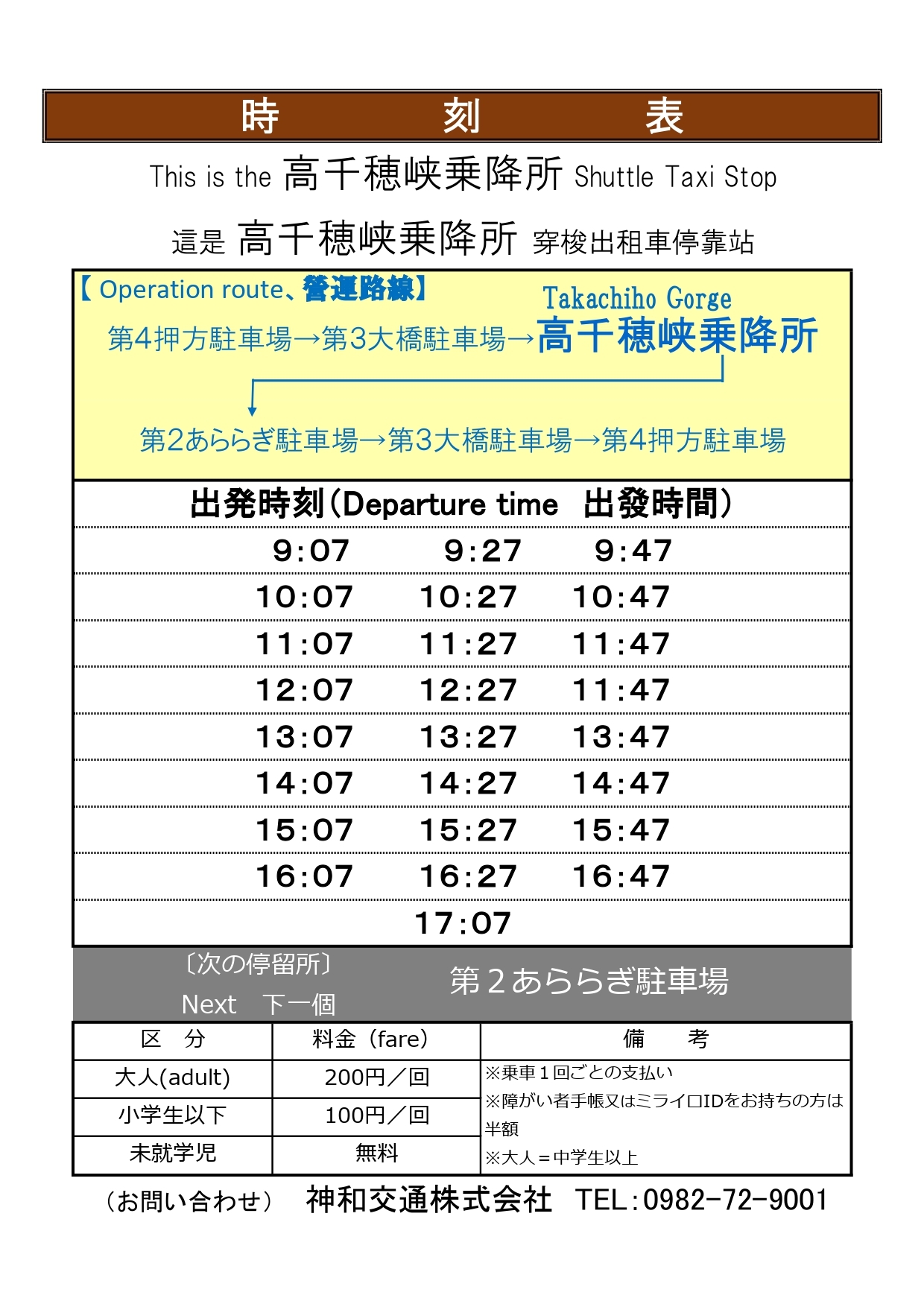 路線(環狀運行): 第4號押方停車場 → 第3號大橋停車場 → 高千穗峽上下車點(靠近高千穗峽石碑) → 第2號阿拉拉木停車場 → 第3號大橋停車場 → 返回第4號押方停車場班次時刻:
