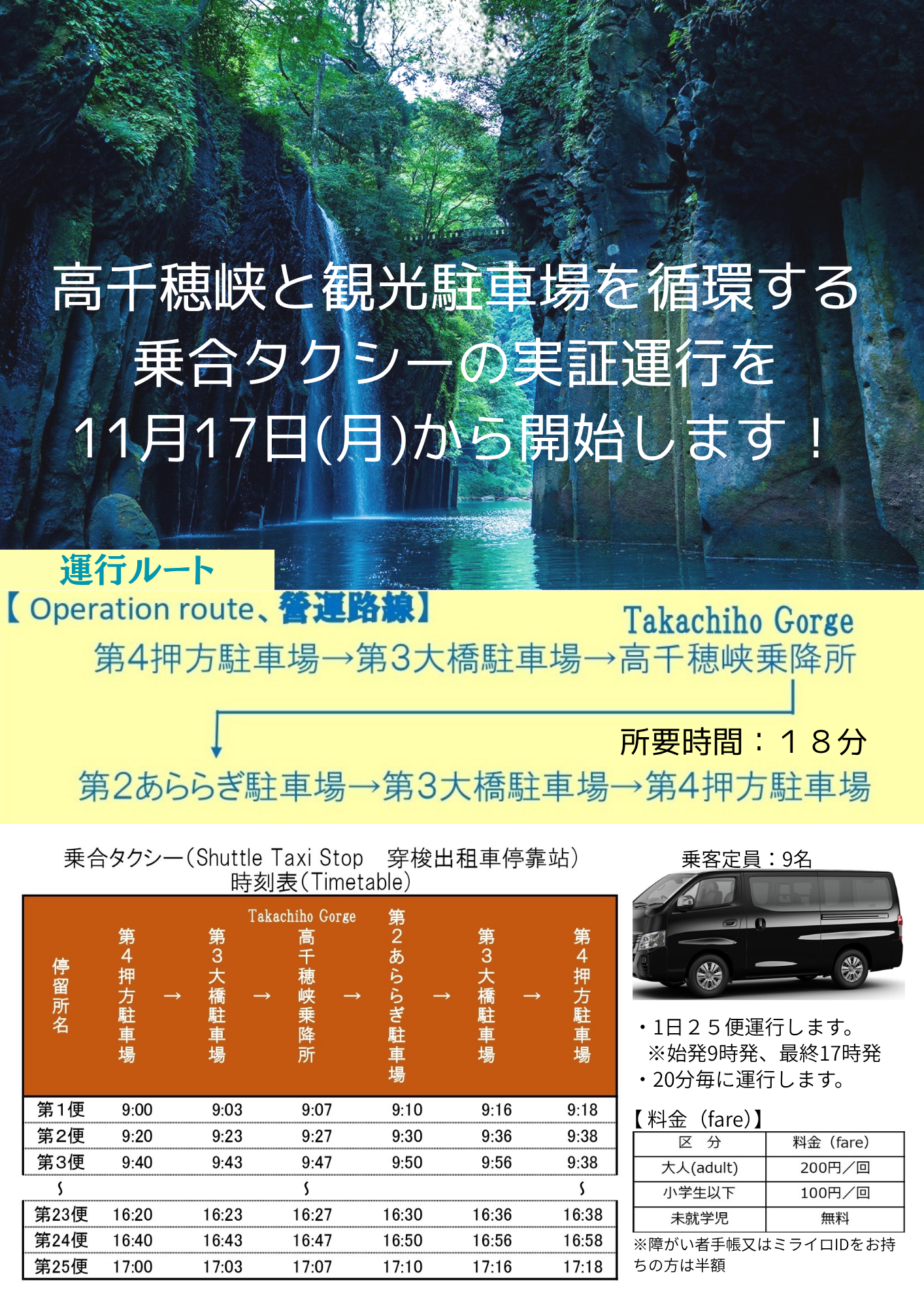 高千穂峡と観光駐車場を循環する「乗合タクシー」の実証運行を11/17(月曜日)、午前9時から開始します。※運行会社:神和交通株式会社