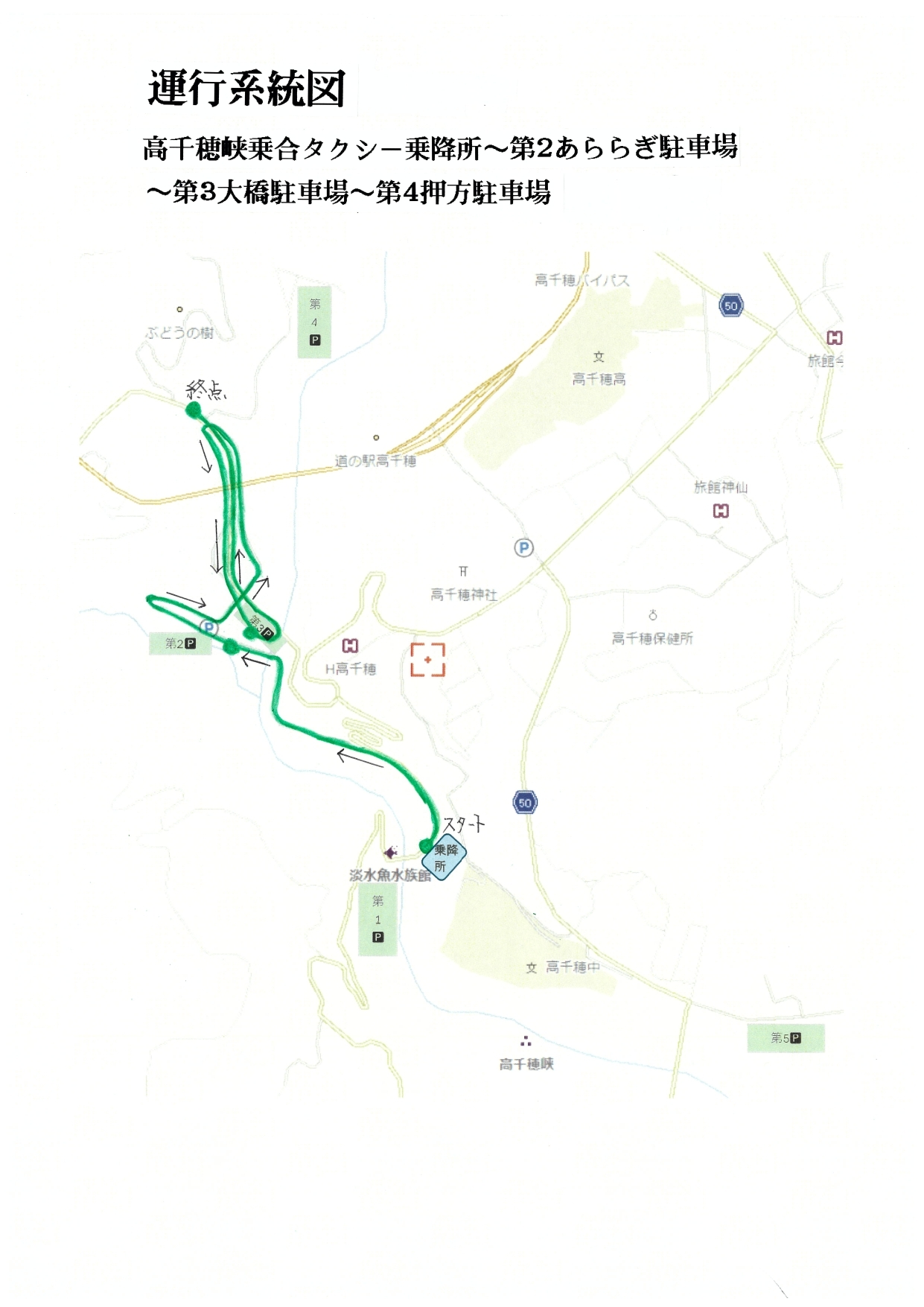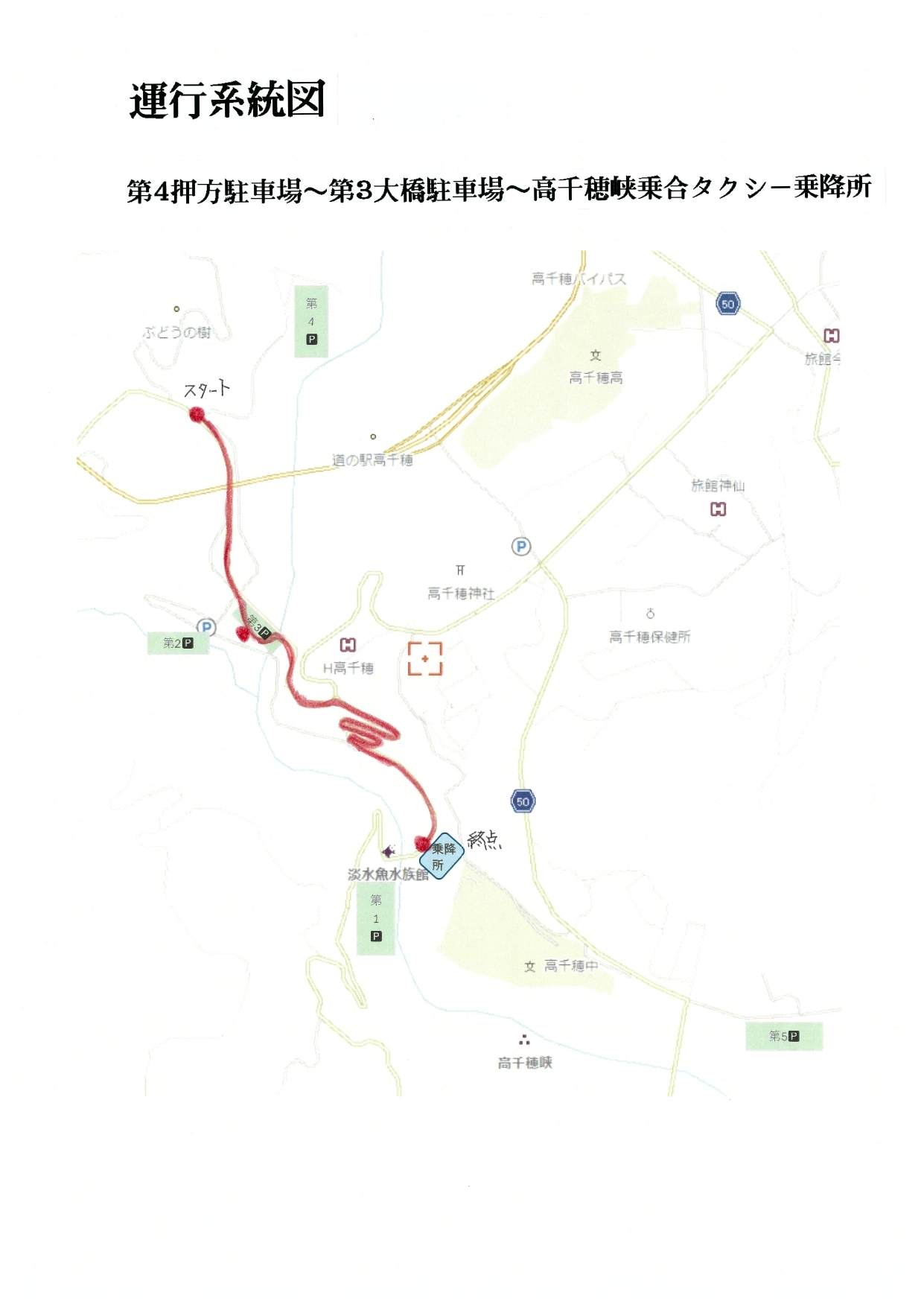第4押方駐車場→第3大橋駐車場→高千穂峡乗降所(高千穂峡石標そば)→第2あららぎ駐車場→第3大橋駐車場→第4押方駐車場